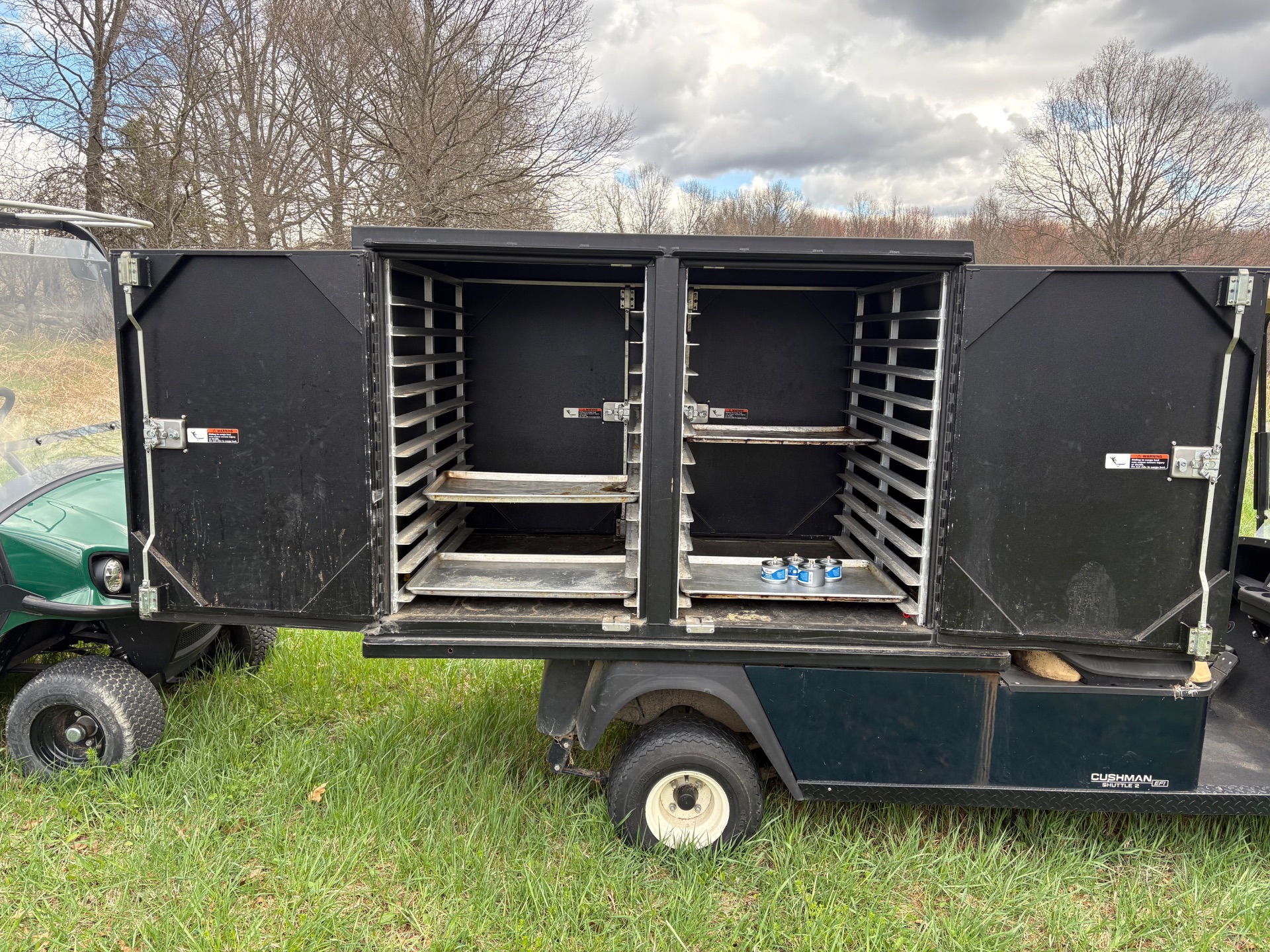 Compact 2-person shuttle configured with a kitchen body to keep food warm, built for reliable service and utility.